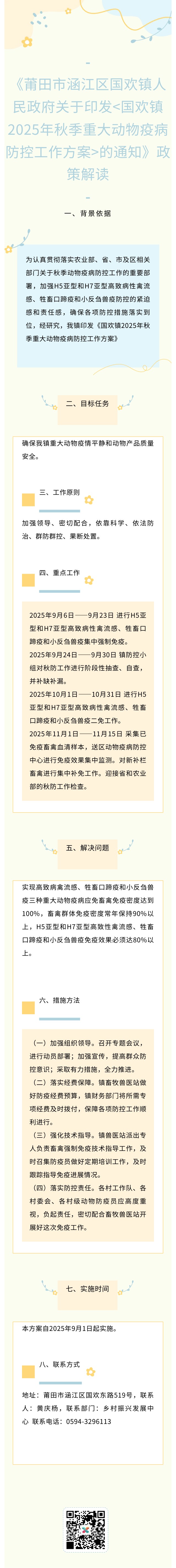 为认真贯彻落实农业部、省、市及区相关部门关于秋季动物疫病防控工作的重要部署,加强H5亚型和H7亚型高致病性禽流感、牲畜口蹄疫和小反刍兽疫防控的紧迫感和责任感,确保各项防控措施落实到位,经研究,我镇印发《国欢镇2025年秋季重大动物疫病防控工作方案》