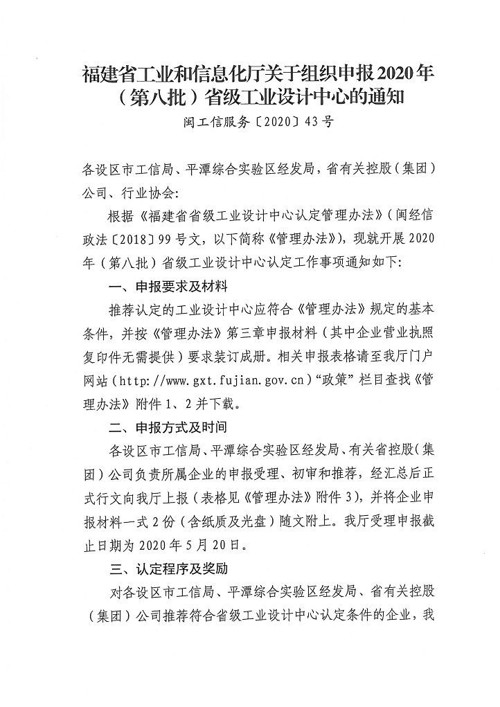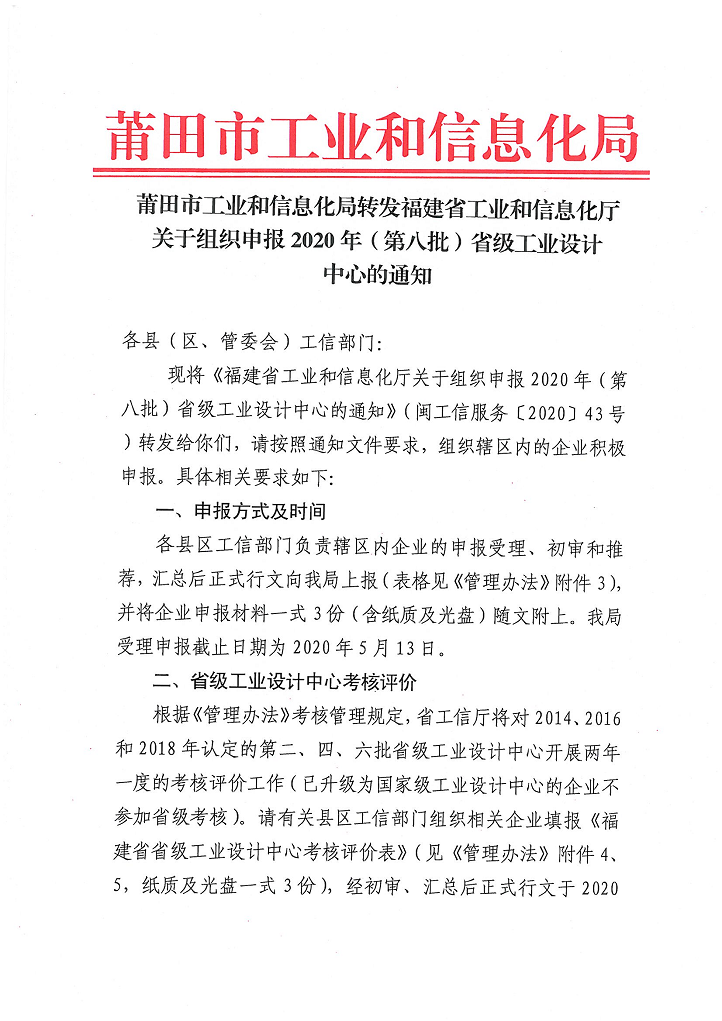 莆田市工信局转发福建省工信厅关于组织申报2020年省级工业设计中心的通知