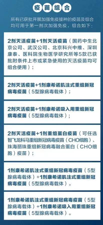 国务院应对新型冠状病毒肺炎疫情联防联控机制综合组下发的《加强老年人新冠病毒疫苗接种工作方案》,明确了6种加强免疫的疫苗组合,任选一种组合进行同源或序贯加强免疫接种,都同样有效。
