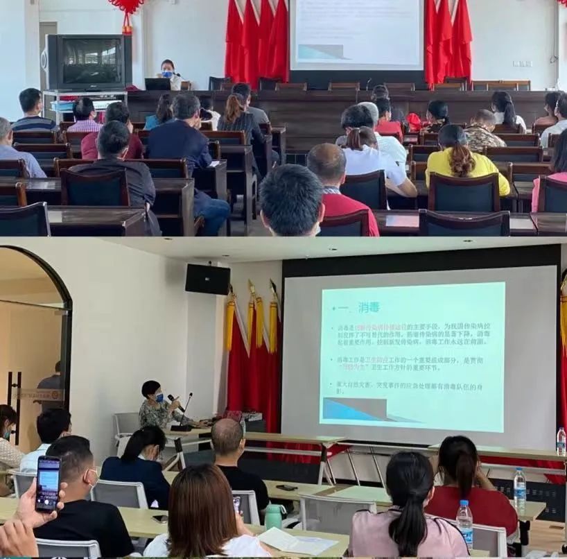 培训会议上,老师对消杀相关知识,依据消杀过程就如何洗手、穿脱防护服、消毒药水的配制、预防性消毒、终末性消毒等重点内容进行详细的介绍;并邀请消杀站工作人员进行手把手实战演练,最后根据目前的消杀配备问题提出改善建议。
