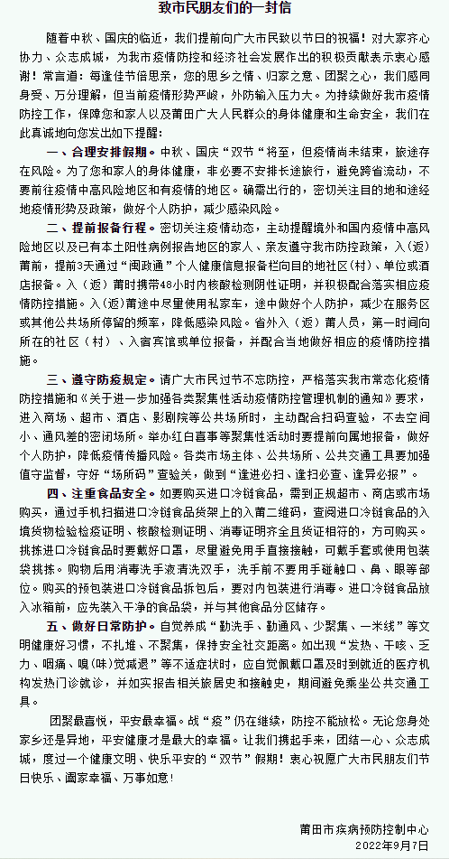 【重要提醒】莆田疾控最新发布!事关中秋国庆假期致市民朋友们的一封信