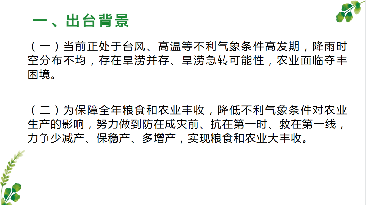 当前正值防汛抗旱的关键时期,也是粮食和农业生产最关键、最重要的时期。预计今年登陆或影响我省台风偏多,夏季或出现阶段性高温干旱,降雨时空分布不均,旱涝并存、旱涝急转可能性都存在,稻飞虱、稻纵卷叶螟、二化螟等病虫总体为中等局部偏重发生,都对农业生产带来不确定性影响。为千方百计夺取全年粮食和农业丰收,夯实经济社会发展基础,特制定本预案。