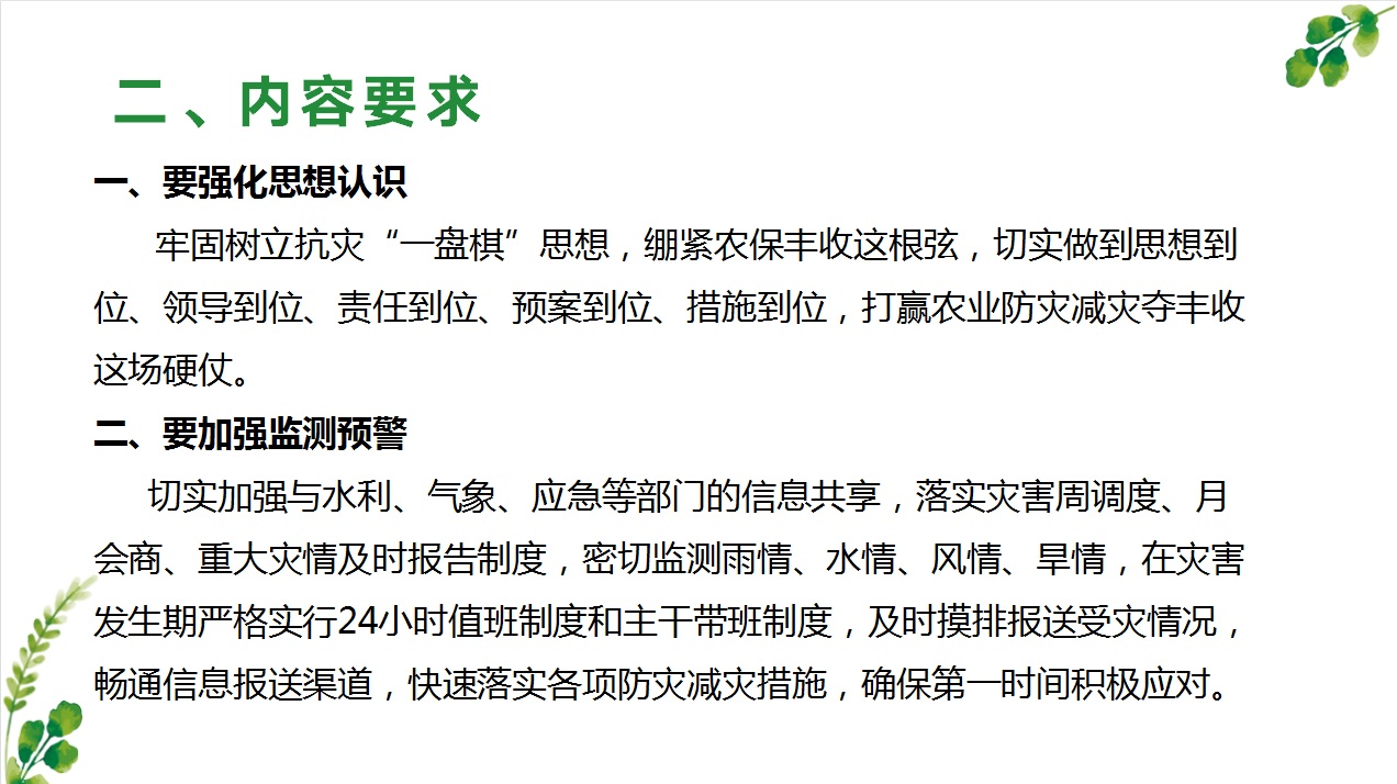 二、要加强监测预警。科学分析研判灾害风险,及时发布灾害性天气预警信息,切实做到信息“准”、预警“早”、应急“快”,为农业生产安全争取提前量。要加强与水利、气象、应急等部门的信息共享,落实灾害周调度、月会商、重大灾情及时报告制度,加强应急值守,密切监测雨情、水情、风情、旱情,在灾害发生期严格实行24小时值班制度和主干带班制度,及时摸排报送受灾情况,畅通信息报送渠道,快速落实各项防灾减灾措施,确保第一时间积极应对。