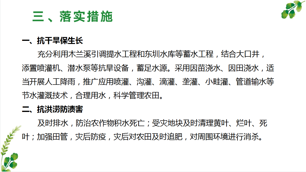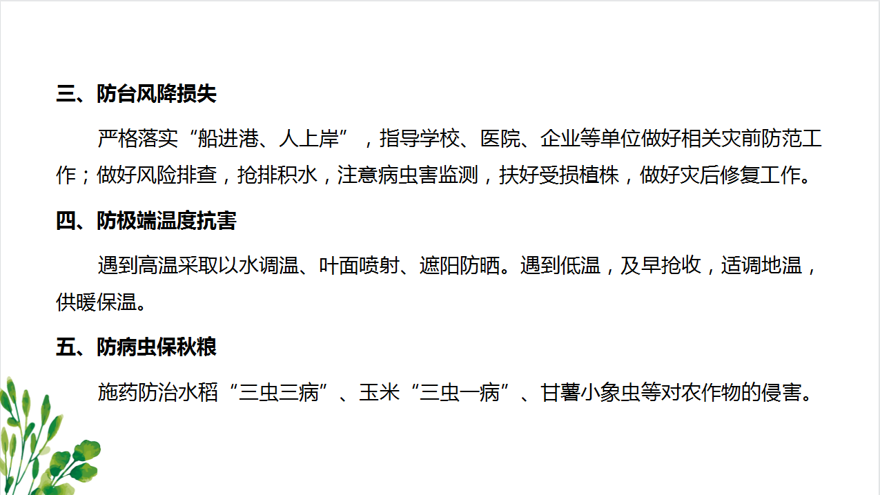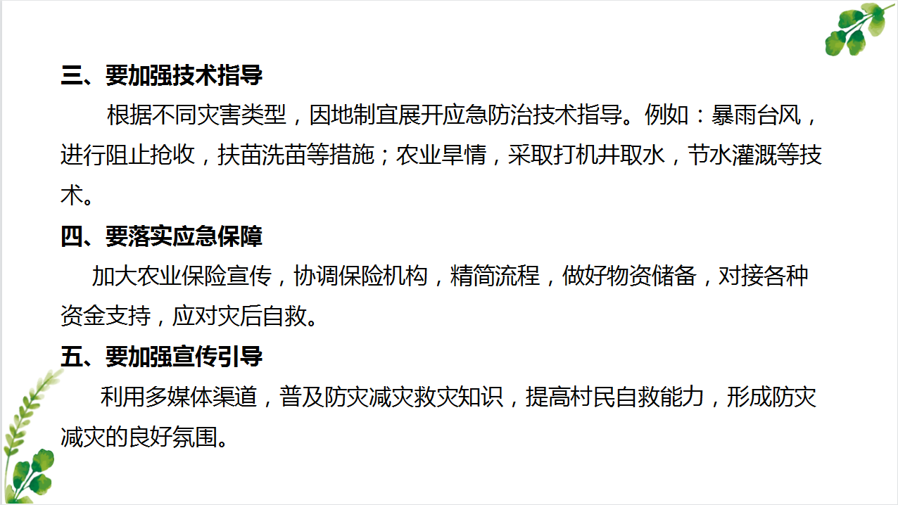 三、要加强技术指导。提高农业减灾防灾的能力。要根据不同的灾害类型,结合当地不同作物的生产特点,进一步完善农业防灾减灾措施:如雨情台风等灾害,要因地制宜指导采取组织抢收、改种补种、扶苗洗苗等措施,并大力开展统防统治、应急防治,最大限度降低病虫危害,减轻灾害影响;农业旱情,要引导组织农民蓄水或规范打机井取水,推广合理农业用水,滴灌、喷灌等节水灌溉技术等。