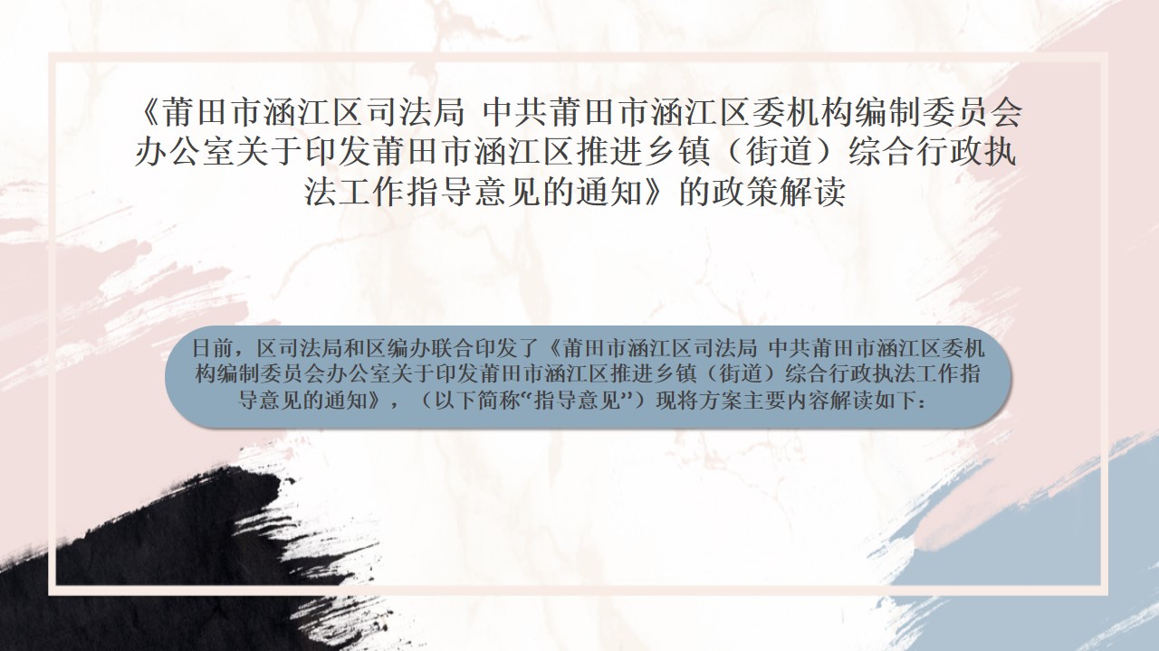 日前,区司法局和区编办联合印发了《莆田市涵江区司法局中共莆田市涵江区委机构编制委员会办公室关于印发莆田市涵江区推进乡镇(街道)综合行政执法工作指导意见的通知》(以下简称《指导意见》),现将方案主要内容解读如下: