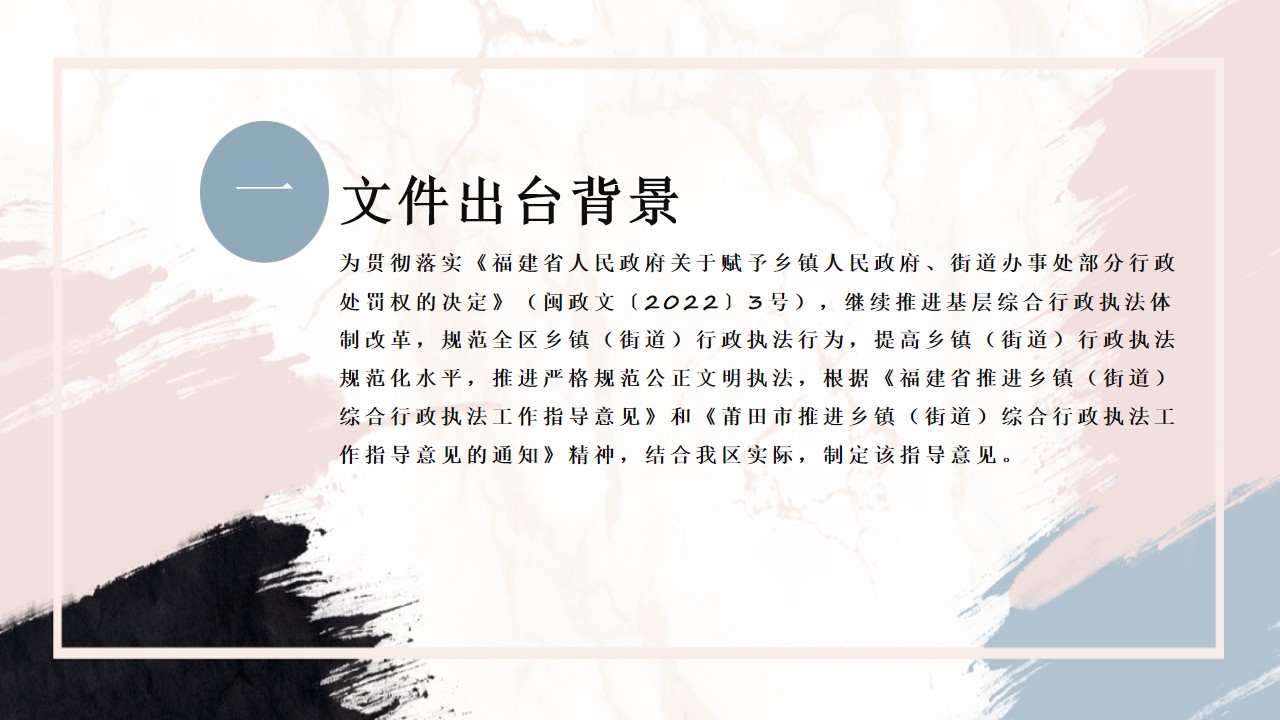为贯彻落实《福建省人民政府关于赋予乡镇人民政府、街道办事处部分行政处罚权的决定》 (闽政文(2022)3号),继续推进基层综合行政执法体制改革,规范全区乡镇(街道)行政执法行为,提高乡镇(街道)行政执法规范化水平,推进严格规范公正文明执法,根据《福建省推进乡镇(街道)综合行政执法工作指导意见》和《莆田市推进乡镇(街道)综合行政执法工作指导意见的通知》精神,结合我区实际,制定该指导意见。