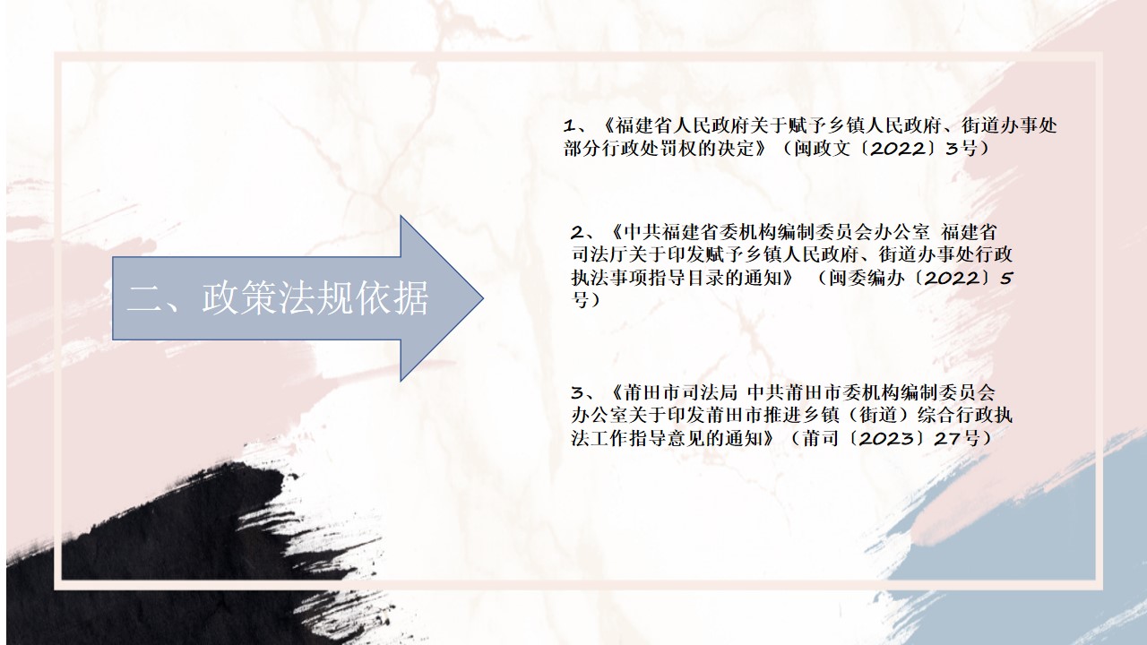 1.《福建省人民政府关于赋予乡镇人民政府、街道办事处部分行政处罚权的决定》(闽政文(2022)3号)