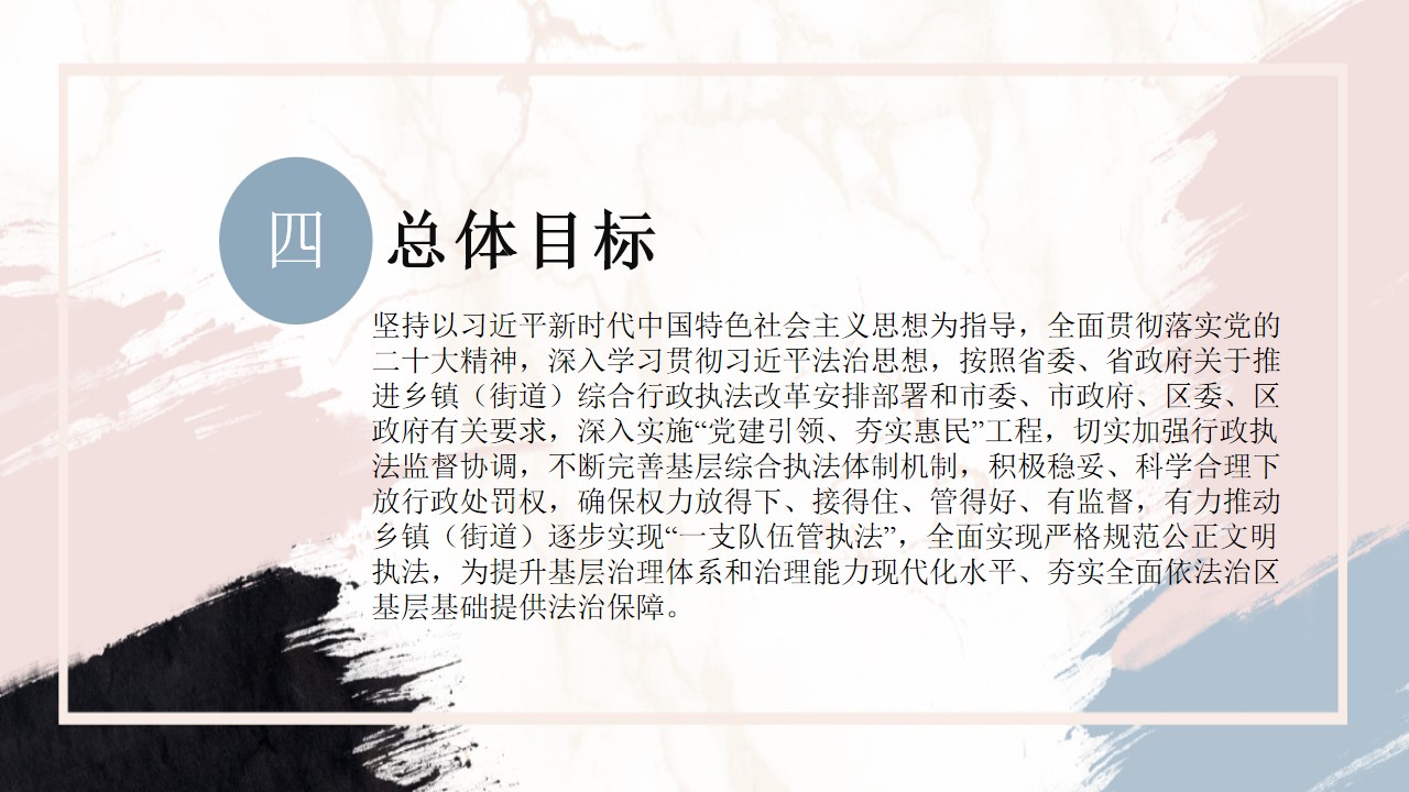 坚持以习近平新时代中国特色社会主义思想为指导,全面贯彻落实党的二十大精神,深入学习贯彻习近平法治思想,按照省委、省政府关于推进乡镇(街道)综合行政执法改革安排部署和市委、市政府、区委、区政府有关要求,深入实施“党建引领、夯实惠民”工程,切实加强行政执法监督协调,不断完善基层综合执法体制机制,积极稳妥、科学合理下放行政处罚权,确保权力放得下、接得住、管得好、有监督,有力推动乡镇(街道)逐步实现“一支队伍管执法”,全面实现严格规范公正文明执法,为提升基层治理体系和治理能力现代化水平、夯实全面依法治区基层基础提供法治保障。