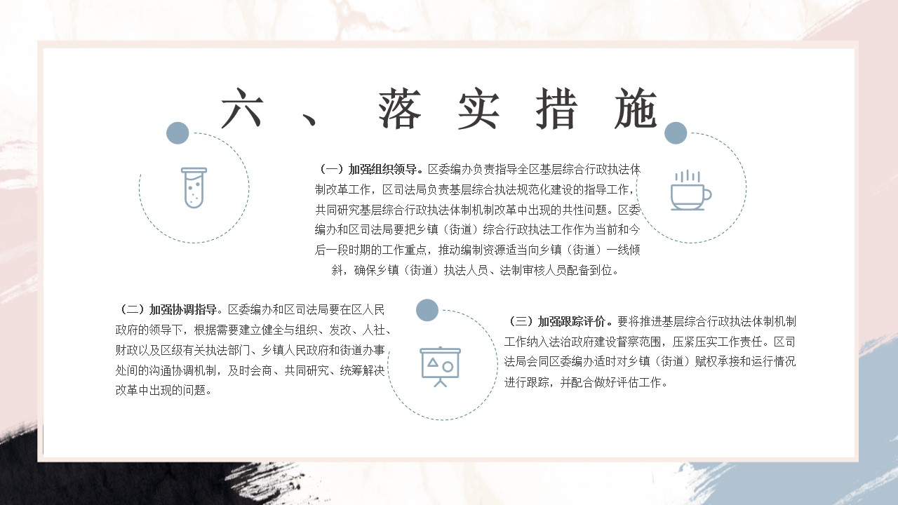 (一)加强组织领导。区委编办负责指导全区基层综合行政执法体制改革工作,区司法局负责基层综合执法规范化建设的指导工作,共同研究基层综合行政执法体制机制改革中出现的共性问题。区委编办和区司法局要把乡镇(街道)综合行政执法工作作为当前和今后一段时期的工作重点,推动编制资源适当向乡镇(街道)一线倾斜,确保乡镇(街道)执法人员、法制审核人员配备到位。