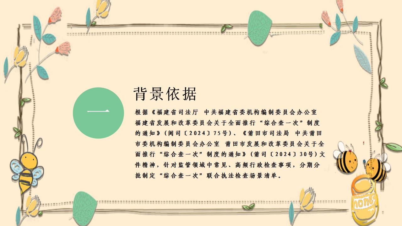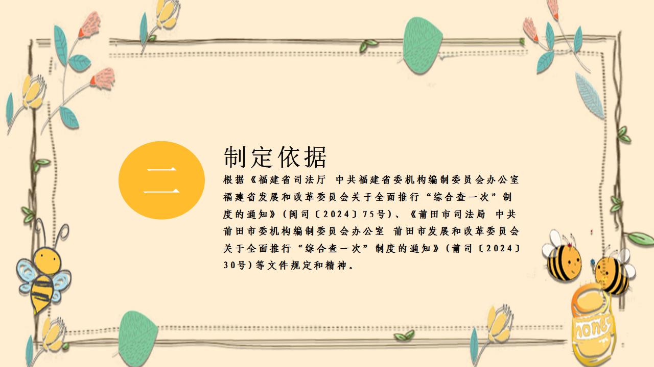 根据《福建省司法厅 中共福建省委机构编制委员会办公室 福建省发展和改革委员会关于全面推行“综合查一次”制度的通知》(闽司〔2024〕75号)、《莆田市司法局 中共莆田市委机构编制委员会办公室 莆田市发展和改革委员会关于全面推行“综合查一次”制度的通知》(莆司〔2024〕30号)等文件规定和精神。