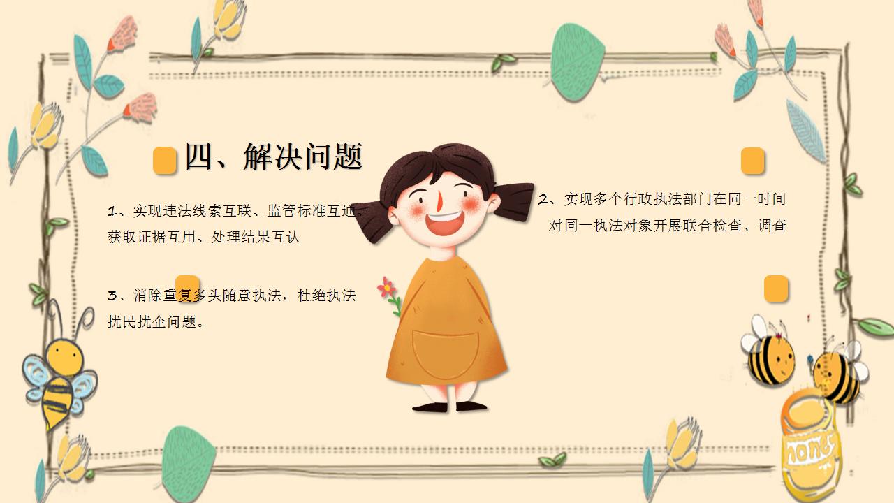 实现违法线索互联、监管标准互通、获取证据互用、处理结果互认;实现多个行政执法部门在同一时间对同一执法对象开展联合检查、调查,切实消除重复多头随意执法,杜绝执法扰民扰企问题。