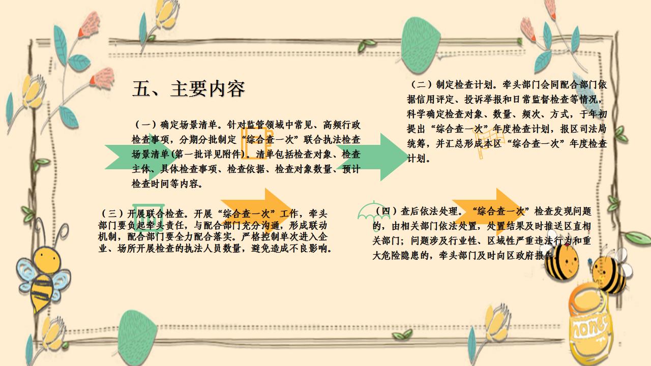 (三)开展联合检查。开展“综合查一次”工作,牵头部门要负起牵头责任,与配合部门充分沟通,形成联动机制,配合部门要全力配合落实。严格控制单次进入企业、场所开展检查的执法人员数量,避免造成不良影响。