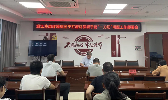 近日,涵江生态环境局召开“打着环保幌子搞‘一刀切’问题”工作推进会,局长陈德兴主持会议并发表讲话,局领导班子成员、相关股室及大队负责人参会。 会上,局长传达了全区群众身边不正之风和腐败问题集中整治工作推进会精神,并就下一步工作进行部署。