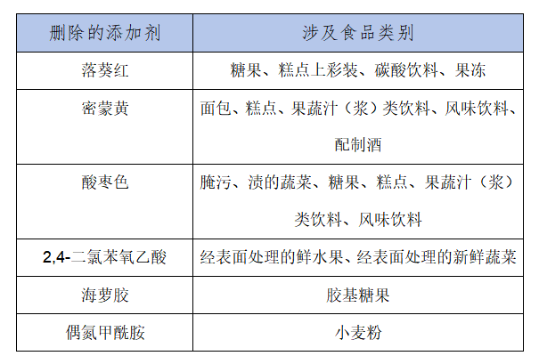 落葵红、密蒙黄、酸枣色、2,4-二氯苯氧乙酸、海萝胶、偶氮甲酰胺在新版的食品添加剂使用标准中被删除,不得在各类食品中使用,具体涉及类别见下表。