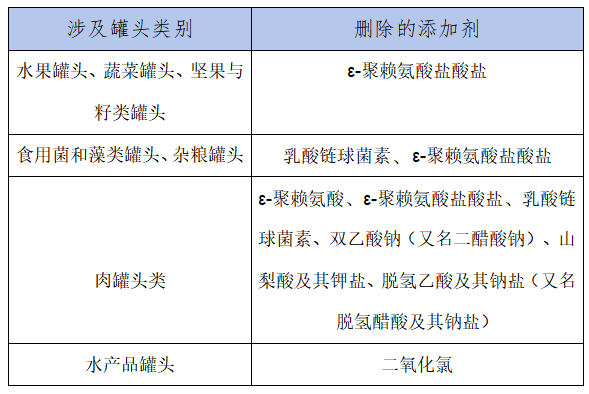 罐头食品中不得再使用防腐剂,具体涉及罐头类别对应的食品添加剂见下表。