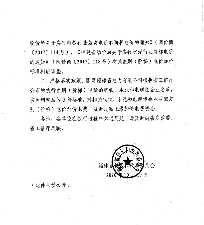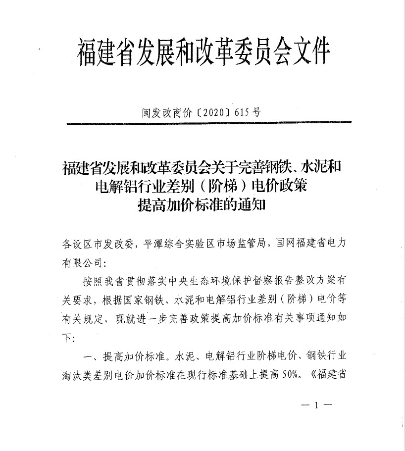 现将《福建省发展和改革委员会关于完善钢铁、水泥和电解铝行业差别(阶梯)电价政策提高加价标准的通知》(闽发改商价〔2020〕615号)转发给你单位,请遵照执行。