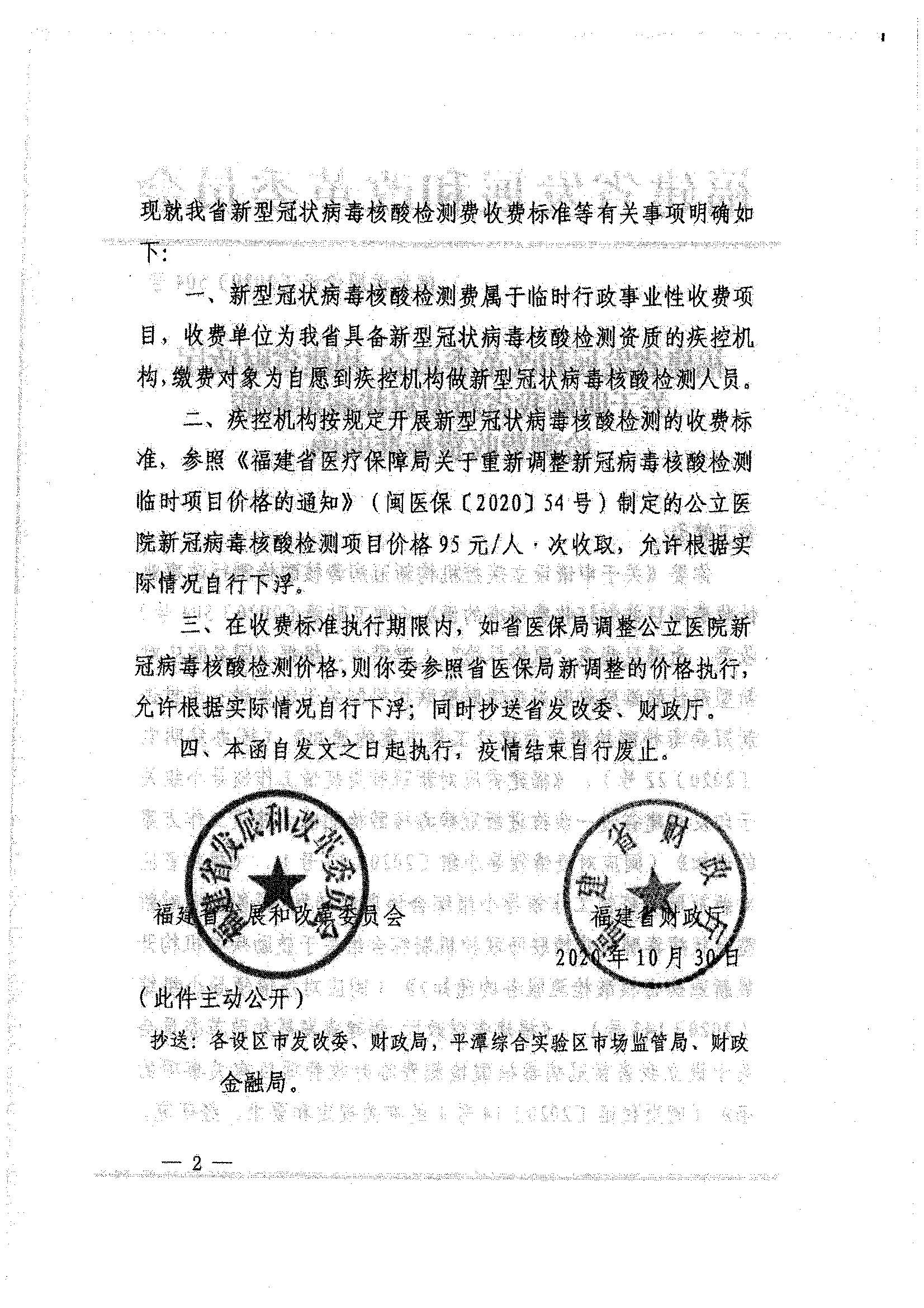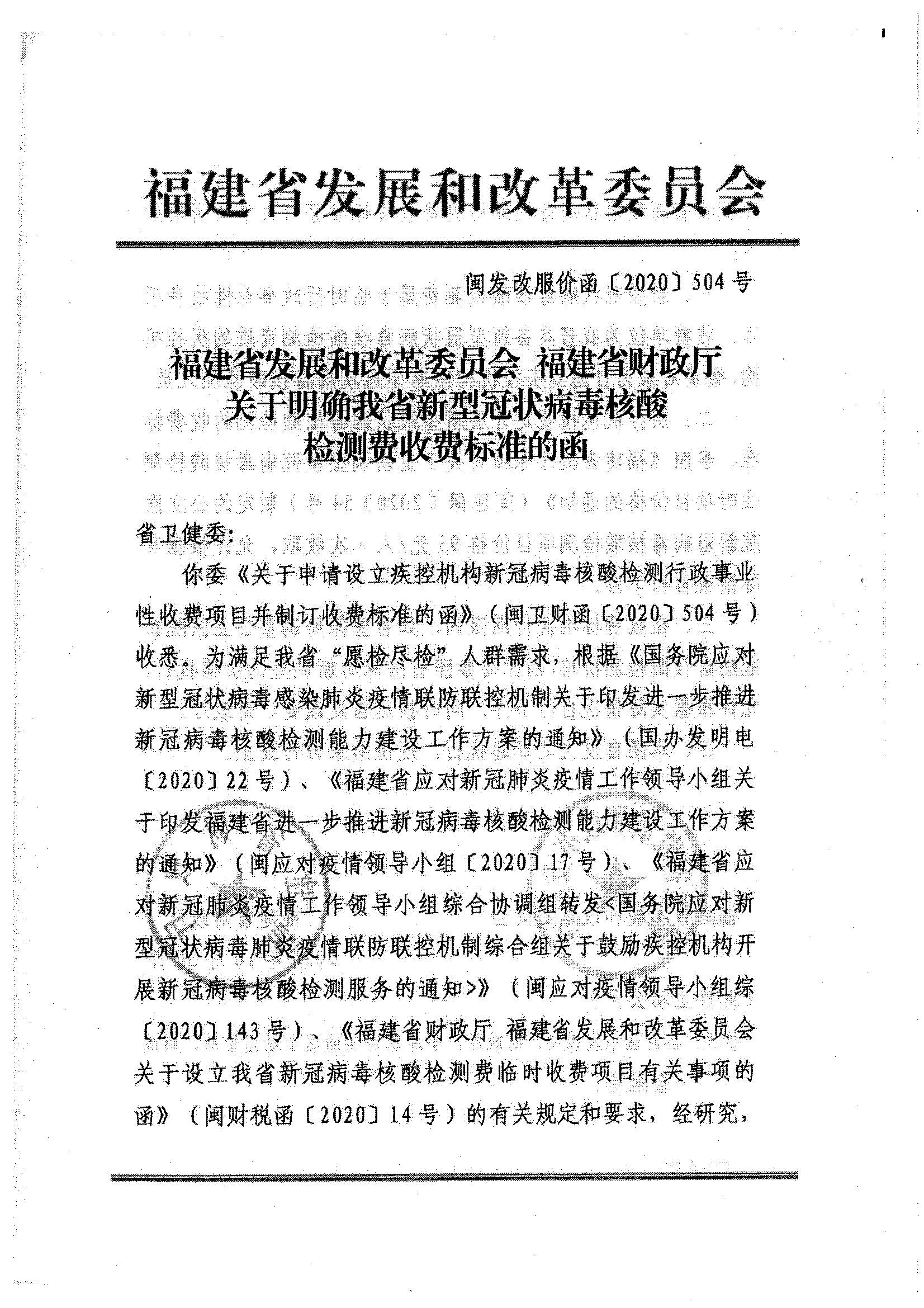 现将《福建省发展和改革委员会 福建省财政厅关于明确我省新型冠状病毒核酸检测费收费标准的函》(闽发改服价函〔2020〕504号)转发给你们,并将有关要求明确如下,请一并遵照执行。