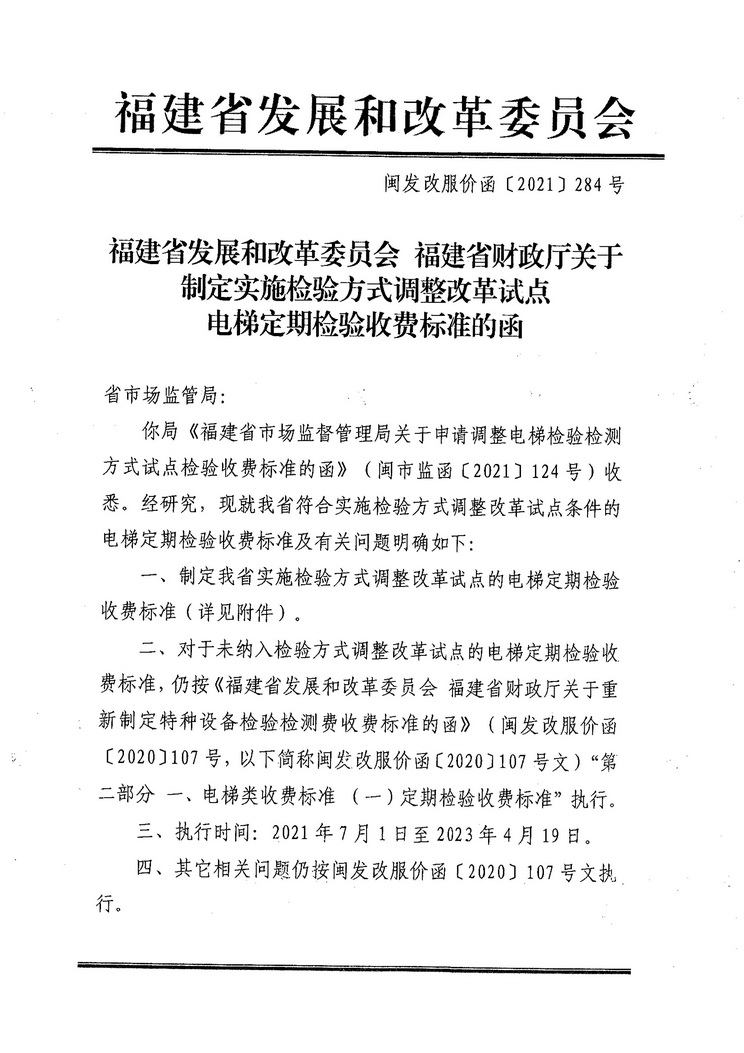 现将《福建省发展和改革委员会 福建省财政厅关于制定实施检验方式调整改革试点电梯定期检验收费标准的函》(闽发改服价函〔2021〕284号)转发给你们,请遵照执行,并按规定做好收费标准变动情况报告、收费公示等相关工作。