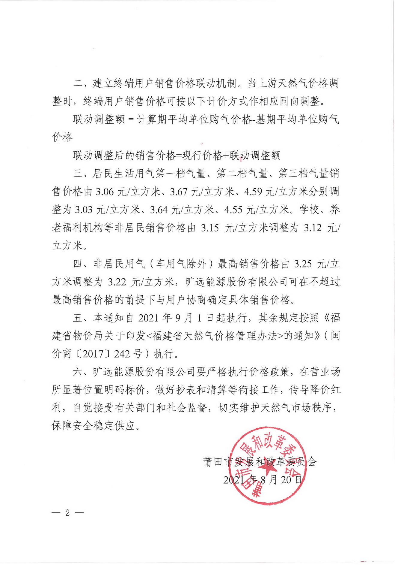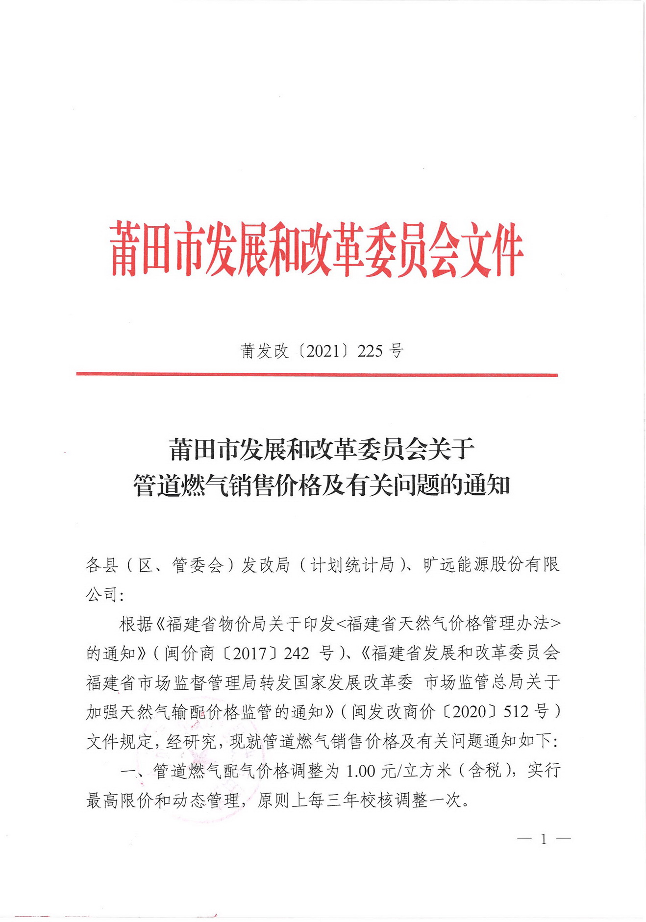 莆田市发展和改革委关于管道燃气销售价格及有关问题的通知