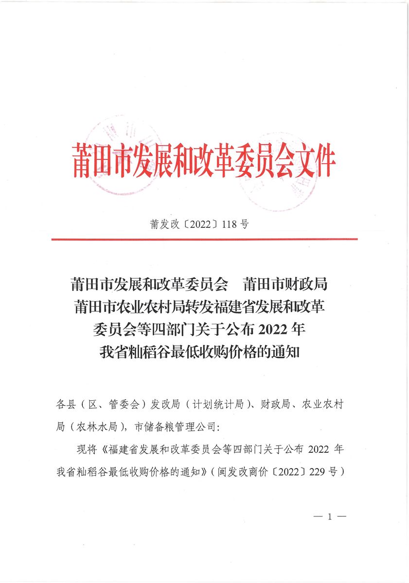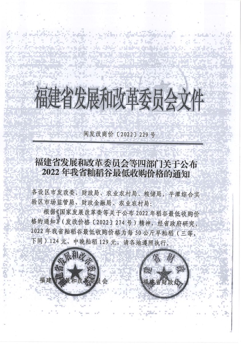 转发福建省发展和改革委员会等四部门关于公布2022年我省籼稻谷最低收购价格的通知