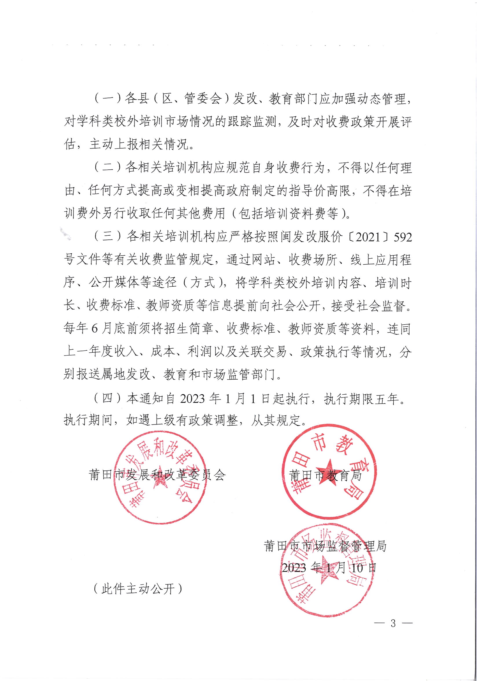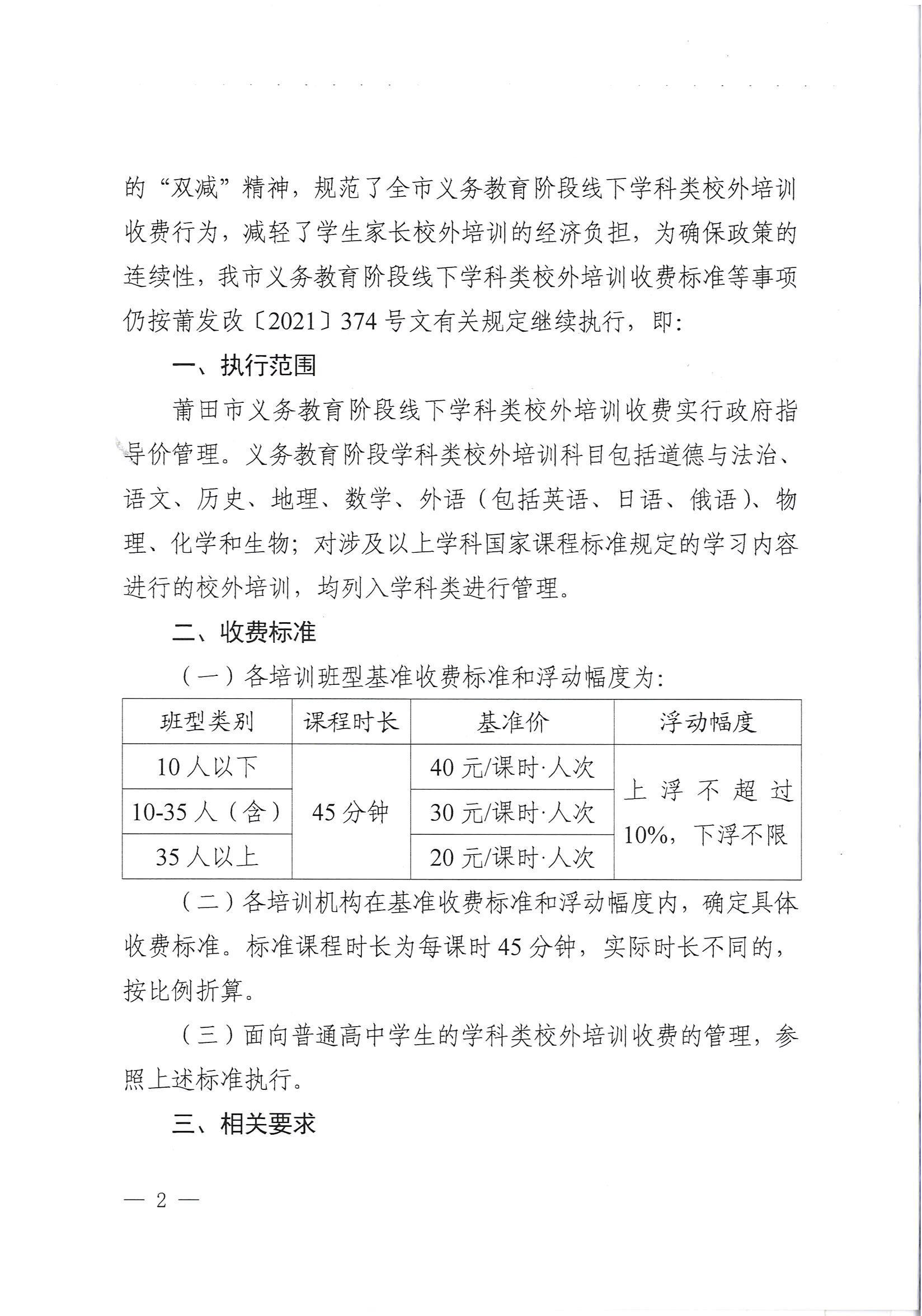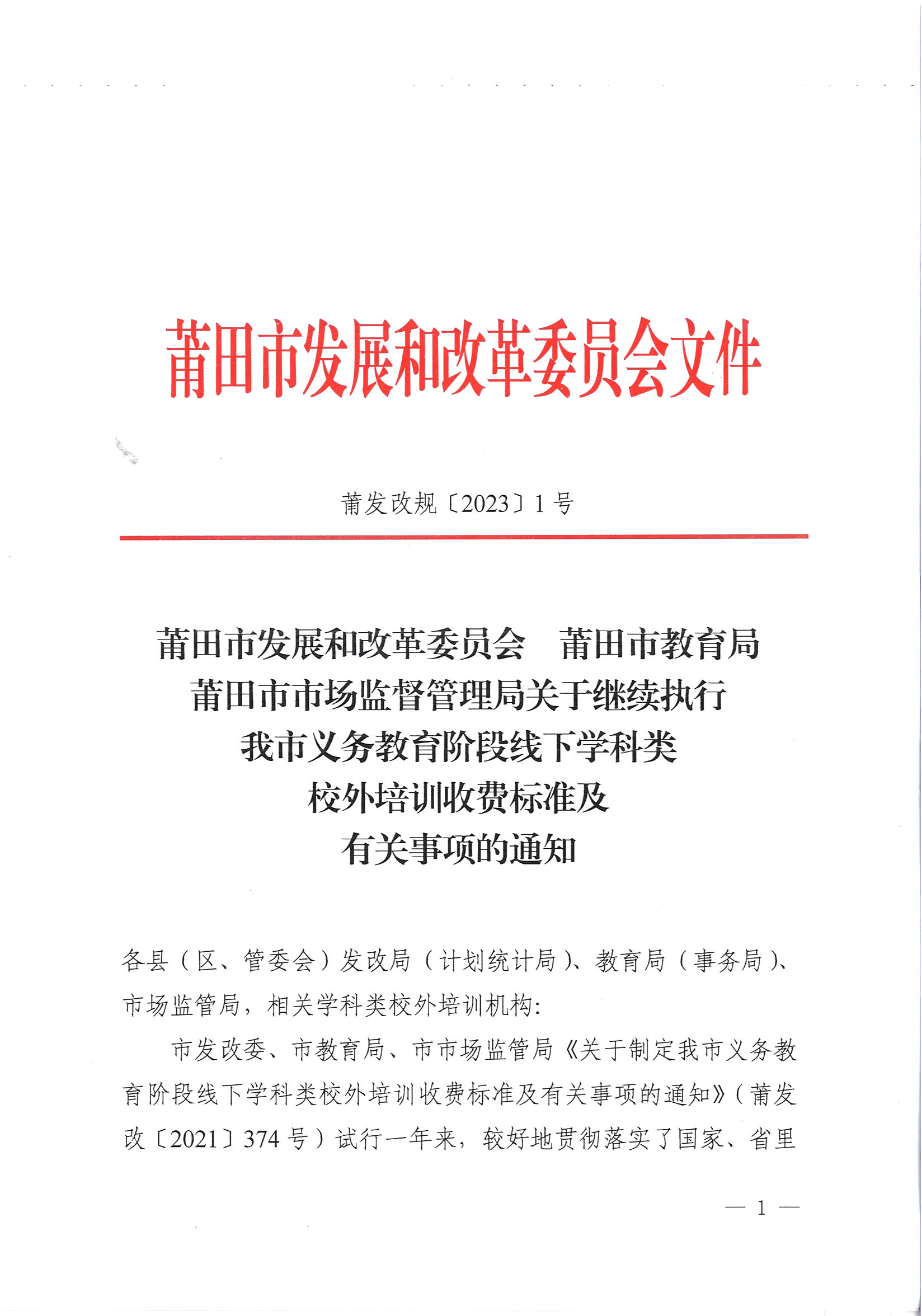 莆田市发展和改革委员会莆田市教育局莆田市市场监督管理局关于继续执行我市义务教育阶段线下学科类校外培训收费标准及有关事项的通知