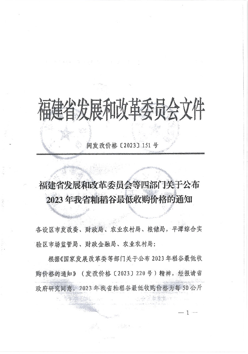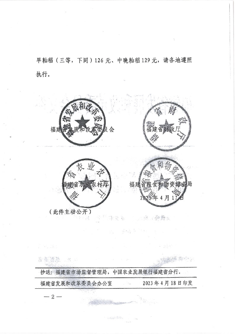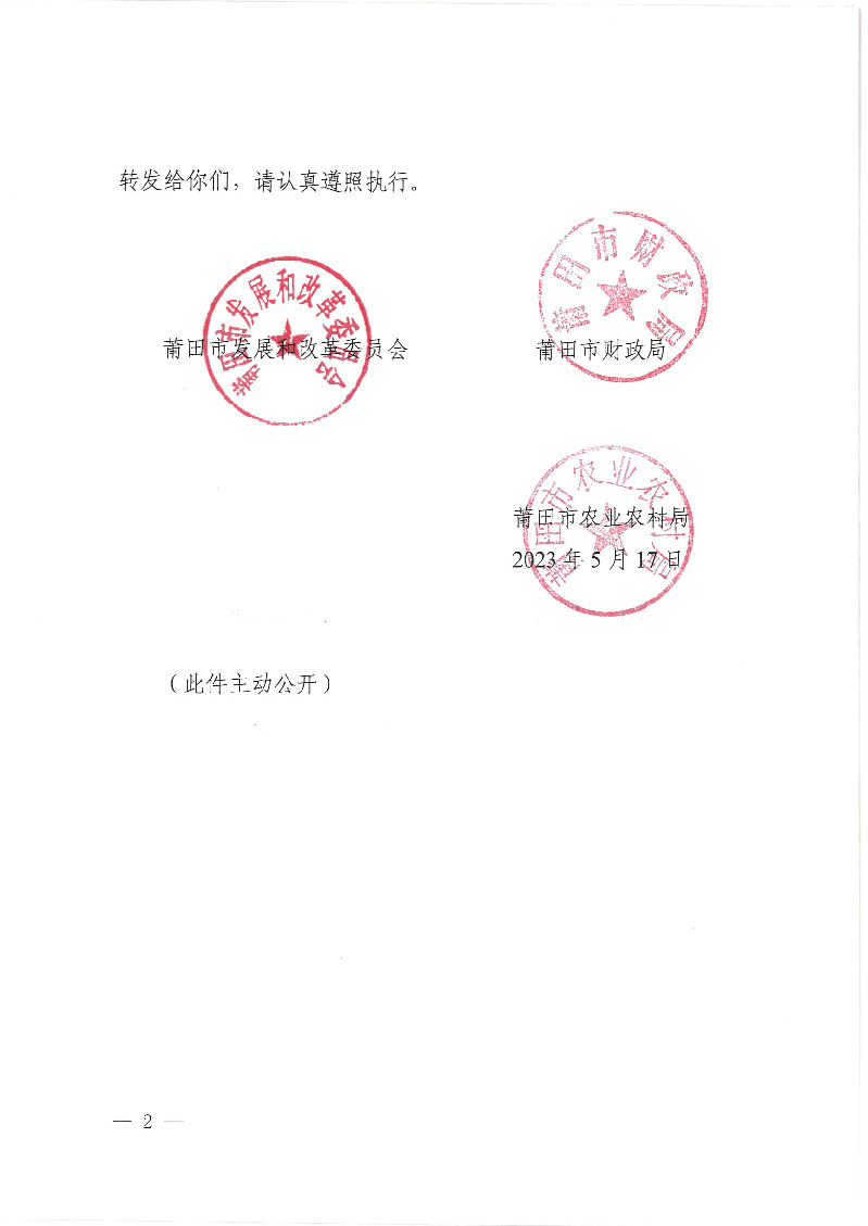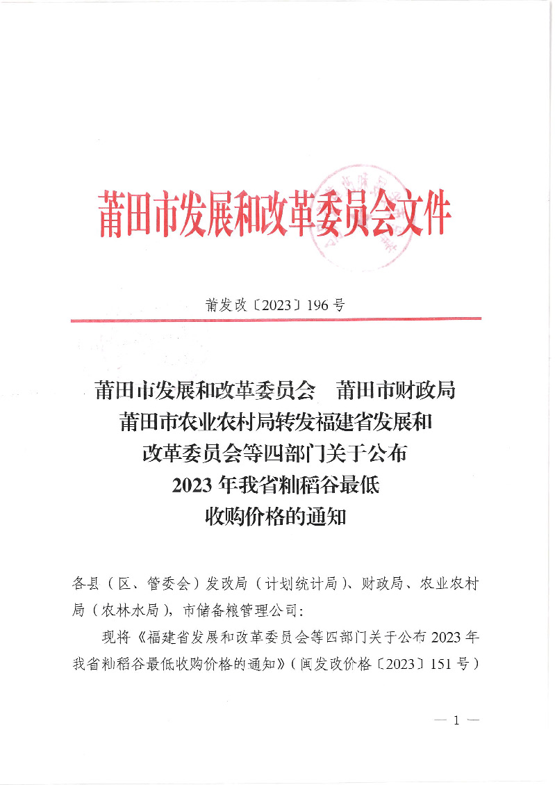 莆田市发展和改革委员会莆田市财政局莆田市农业农村局转发福建省发展和改革委员会等四部门关于公布2023年我省籼稻谷最低收购价格的通知