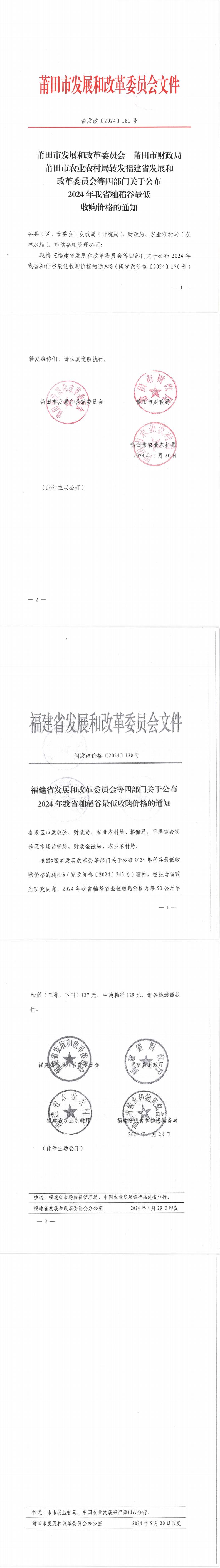 莆田市发展和改革委员会 莆田市财政局 莆田市农业农村局转发福建省发展和改革委员会等四部门关于公布2024年我省籼稻谷最低收购价格的通知