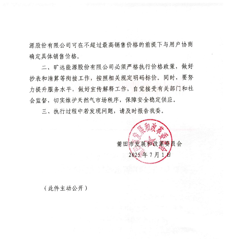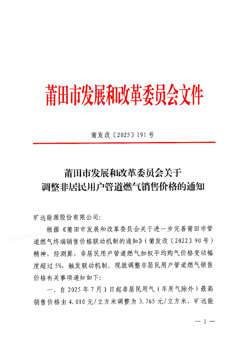 莆田市发展和改革委员会关于调整非居民用户管道燃气销售价格的通知